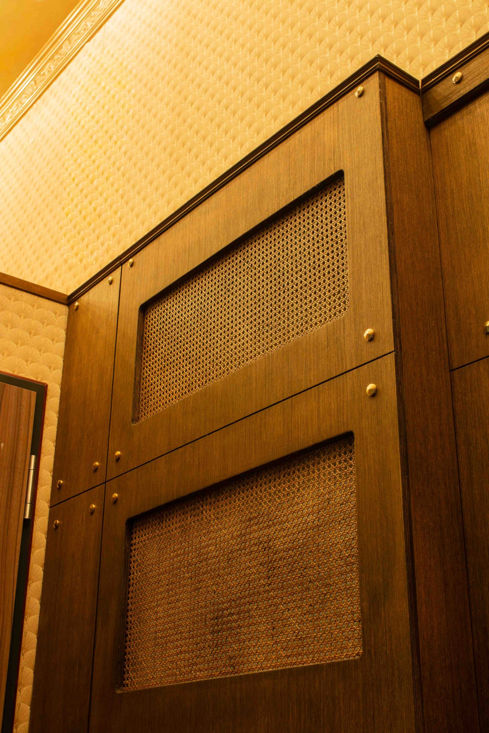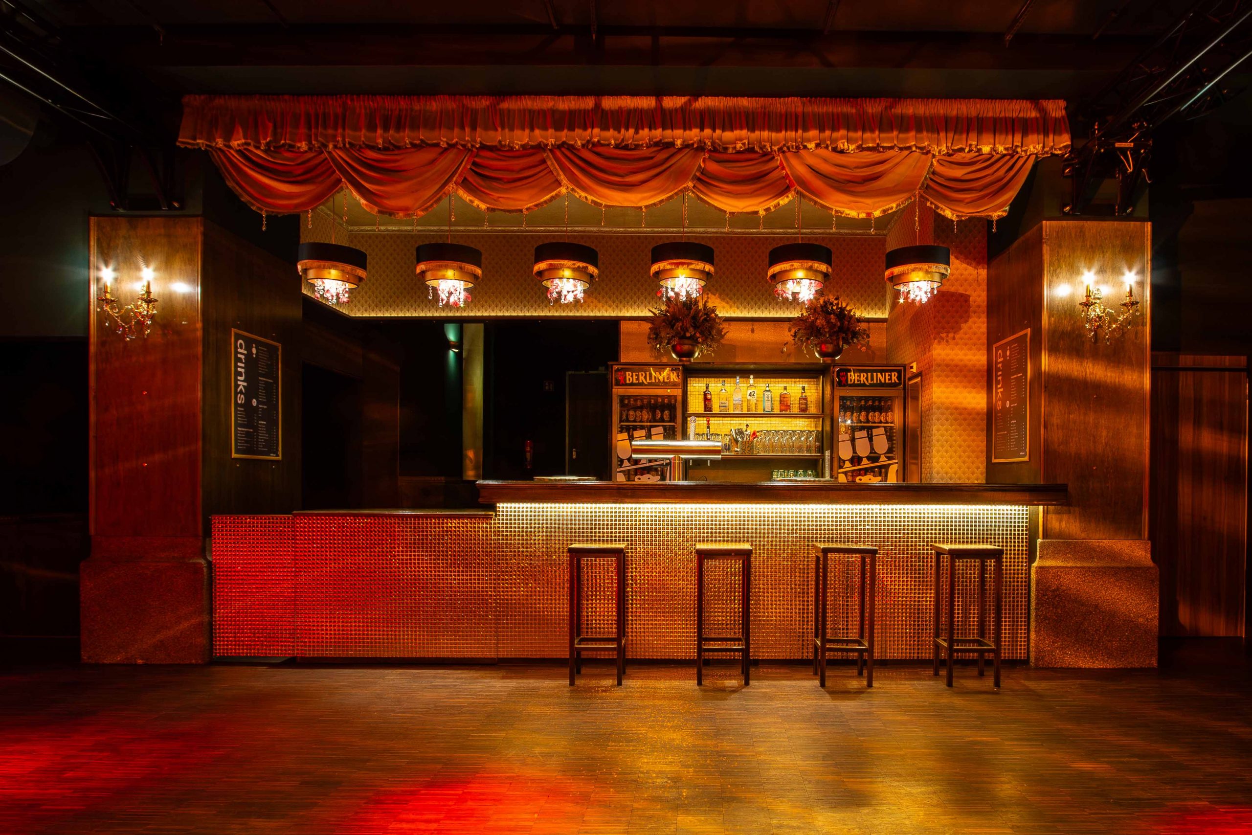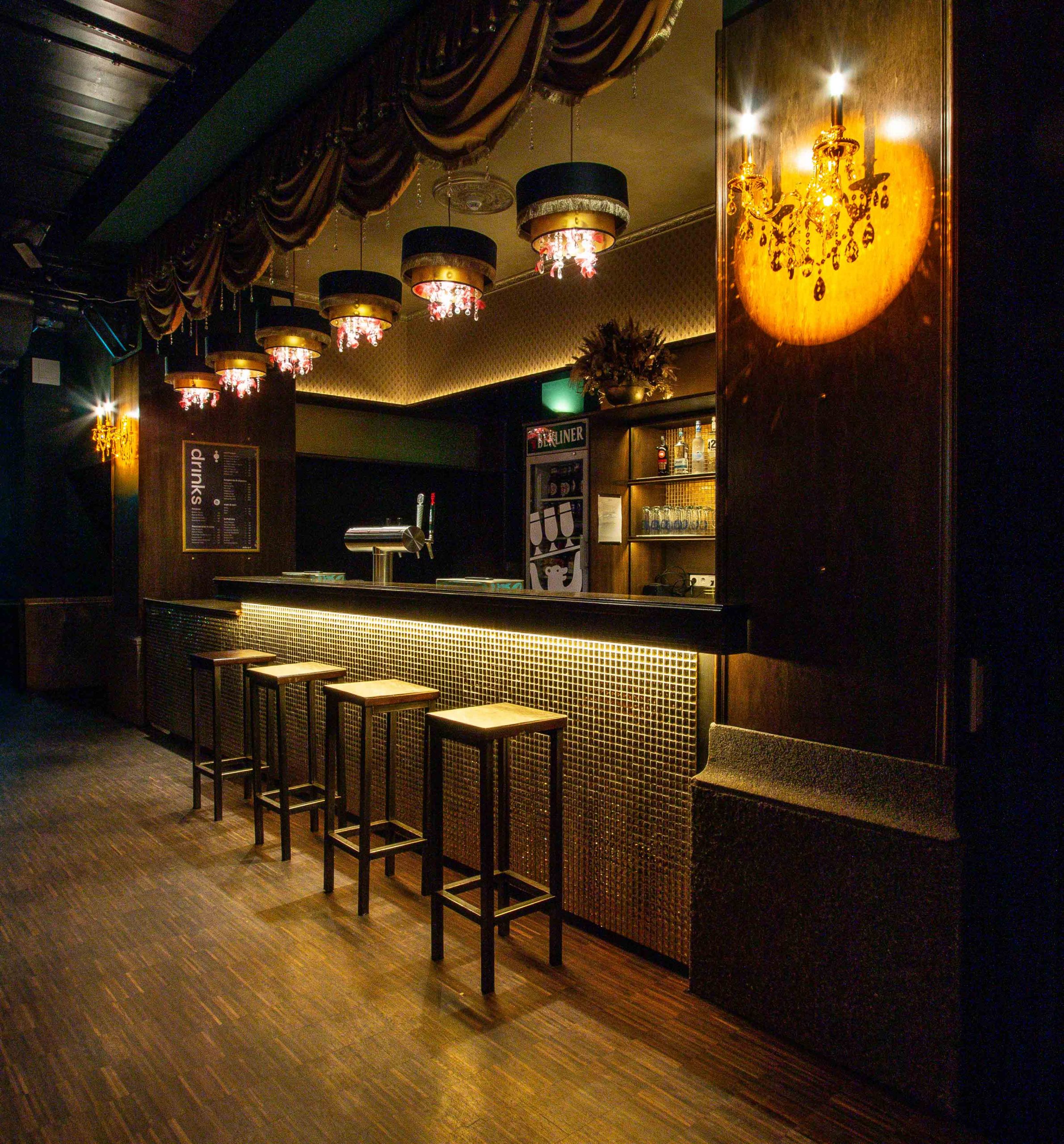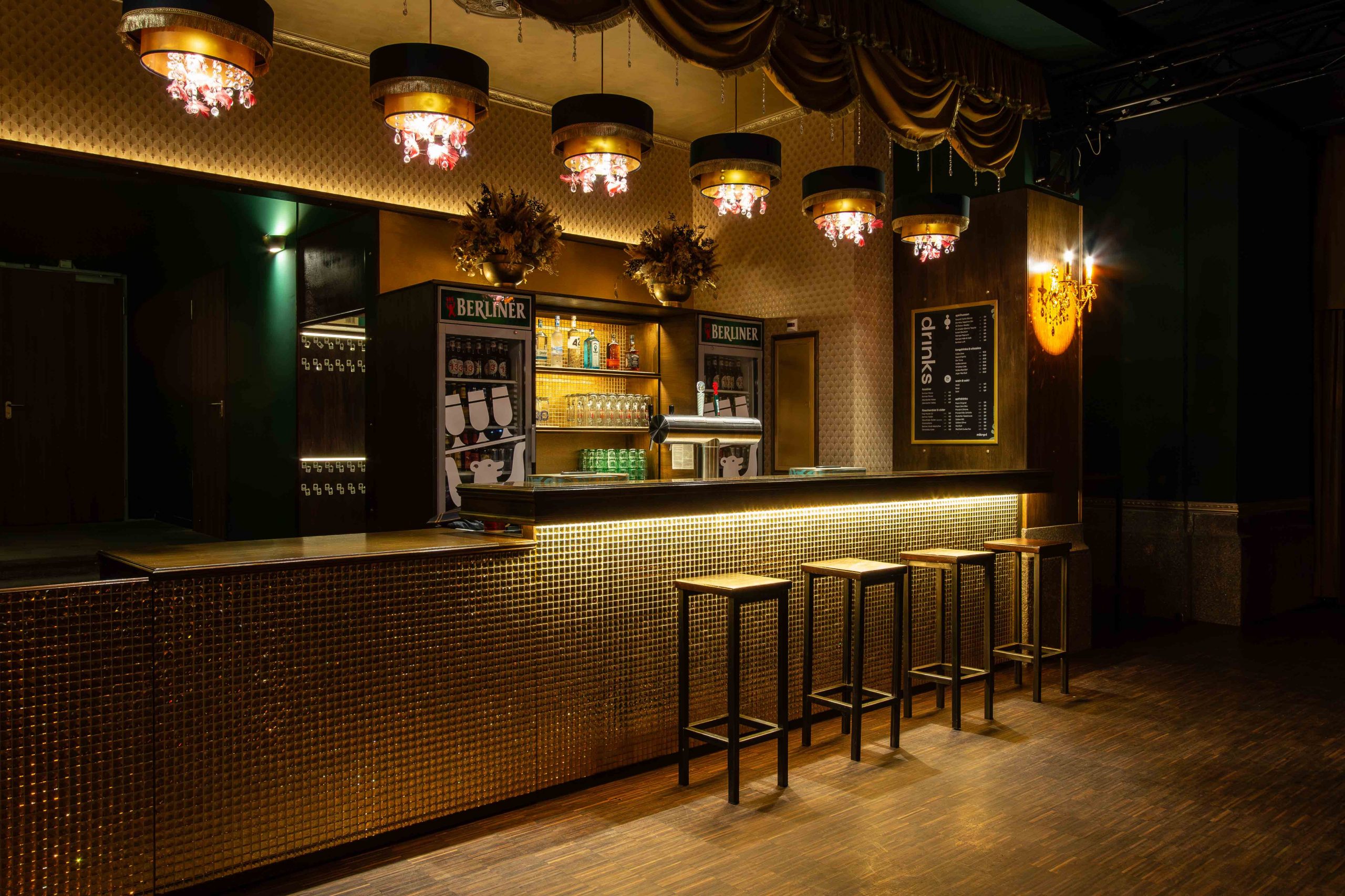 Die Bar bildet das zentrale Herzstück des Mikropol und erhielt von mir auch gestalterisch die höchste Wertigkeit. Hier ist das Thema der goldenen 20er Jahre am konsequentesten ausgearbeitet. Die hochwertige Ausführung ermöglicht sowohl den regulären Clubbetrieb als auch elegante, anspruchsvolle Veranstaltungen. Kurze Laufwege und eine geschickt platzierte Garderobe sorgen zudem für effiziente Abläufe und gute Arbeitsbedingungen für das Personal.