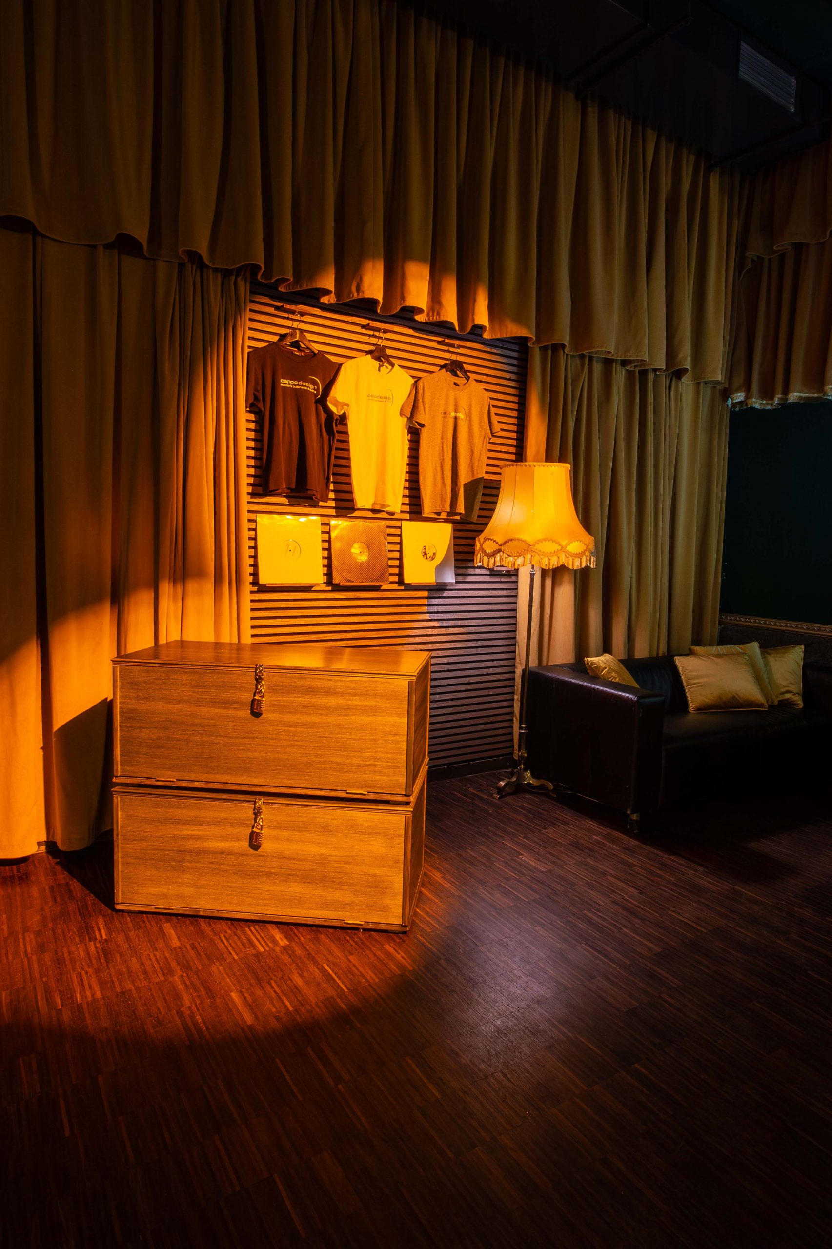 Der Merchandisestand befindet sich direkt am Eingang, gegenüber der Bühne. Sowohl die Vorhänge als auch die Paneele sind raumakustisch wirksam. Durch ein modulares System mit einklickbaren „Utilities“ für T-Shirts oder Schallplatten kann jeder Künstler seinen Stand individuell anpassen. Das eigentliche Highlight verbirgt sich jedoch hinter Vorhang und Paneelen: Ein über die gesamte Wand laufender Plattenabsorber verhindert, dass die von der Bühne kommenden Basswellen direkt in den Raum zurückreflektiert werden.