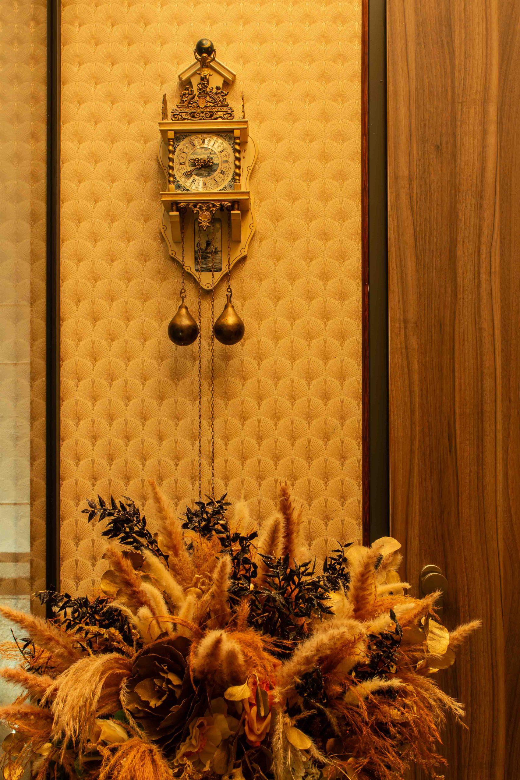 Der Eingangsbereich sollte in seiner Gesamtheit einen stimmigen ersten Eindruck vermitteln, ohne dabei plakativ zu wirken. Kronleuchter schieden bewusst aus – nicht nur aufgrund der unmittelbaren Nachbarschaft zu einem Lampengeschäft mit genau diesem Schwerpunkt, sondern auch aus wirtschaftlichen Gründen. Stattdessen entschied ich mich für eine Lichtinstallation aus 56 Kristallglasleuchten. Da diese Leuchten nicht mehr produziert werden, entstand ein nicht reproduzierbares Unikat. Die klare Gliederung des Kassenbereichs dient zugleich als Orientierung für die Besucher, während die Holzverkleidung eine warme, wohnliche Hülle schafft.