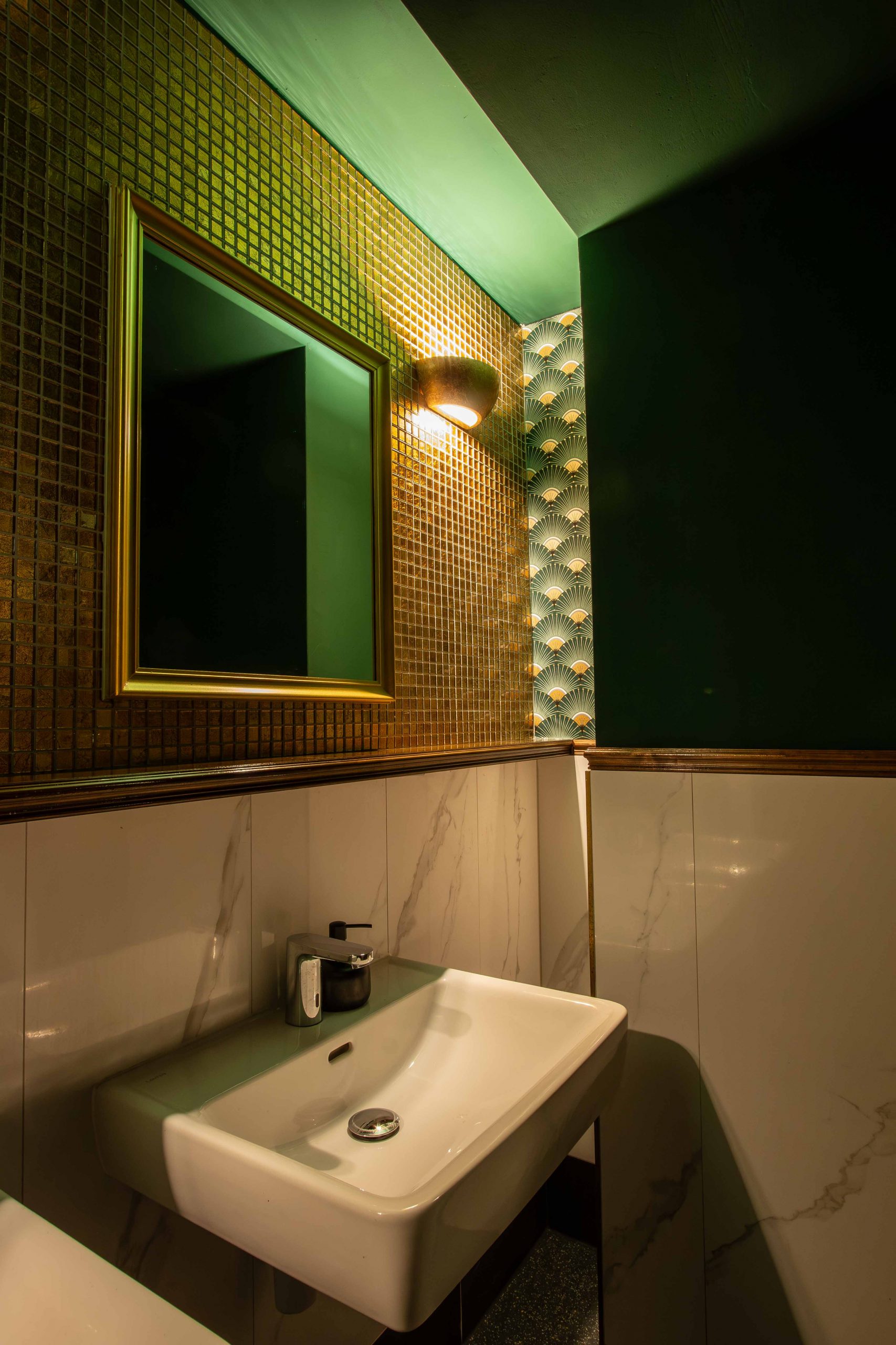 Die WC-Bereiche sind funktional gestaltet und greifen mit Fliesen, Tapeten und Holzablagen die Atmosphäre des Gastraums auf. Die Waschtische für Damen und Herren sind sich an einer Trennwand gegenüberliegend angeordnet. Durch den Einsatz von Spionagespiegeln ist ein schemenhaftes Wahrnehmen des jeweils anderen Raumes möglich – ein spielerisches Detail, das den Charakter des Ortes weiterführt.